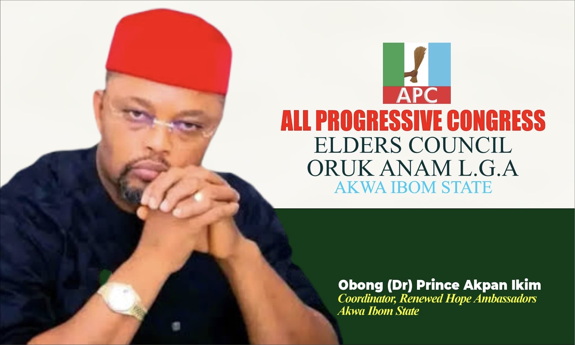 On behalf of All Progressive Congress Elders Council, Oruk Anam Local Government Area in Akwa Ibom State, I felicitate with you, Obong (Dr) Prince Akpan Ikim on your recent appointment as Coordinator, Renewed Hope Ambassadors, Akwa Ibom State Chapter.